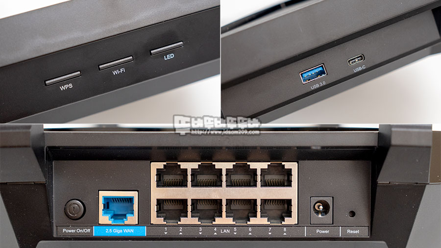 TP-LINK Archer AX6000의 전면에는 WPS, Wi-FI, LED 스위치가 있어 직관적인 조작이 가능하며 오른쪽에는 USB 3.0 단자인 USB-A, USB-C 단자 그리고 후면에는 전원 스위치와 2.5 기가비트 WAN 포트, 무려 8개의 기가비트 랜 포트, 전원 소켓과 리셋 버튼으로 구성되어 무선 인터넷에 포커스를 맞춘 제품과 다르게 유선과 무선 모두 다양한 제품 연결이 가능합니다.