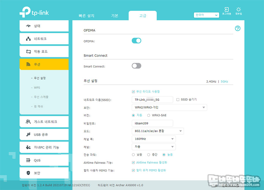 Wi-Fi 6 공유기의 나름 핵심 기능이라 할 수 있는 Smart connect 활성화 시 작동되는 Band Steering 기능은 상대적으로 덜 혼잡한 밴드에 클라이언트로 연결해 주며, 접속한 기기의 접속 환경(802.11b/g/n/ac)에 알맞게 트래픽을 배분 시켜 기기의 사용 시간을 최적화해주는 Airtime Fairness, 다수의 기기와 동시에 무선 신호를 주고받을 수 있게 하는 MUMIMO, 여러 Wi-Fi 6 클라이언트와 동시에 통신을 지원하는 OFDMA 기능 등 사용자가 필요에 의해 활성화해줘야 하는 메뉴로 구성되어있으니 사용에 참고하셔야 할 거 같습니다.