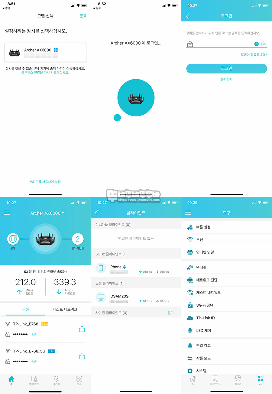 Tether 앱 전용 앱으로 스마트폰과 Archer AX6000 연결 시 Wi-Fi가 아닌 Bluetooth로 연결되기에 빠르고 쉬운 연결을 지원하며 모바일과 웹브라우저의 관리자 메뉴에서 직관적인 UI로 쉬운 메뉴 구성을 보여줍니다.
