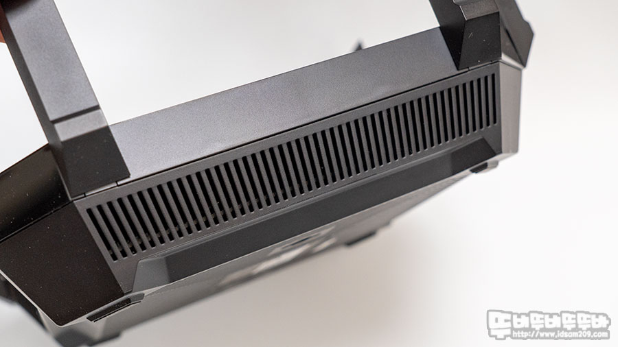 바닥면에는 초기 세팅 시 필요한 2.4GHz/5GHz Wi-Fi SSID와 비밀번호가 인쇄된 라벨과 양옆에는 벽면에 고정할 수 있는 마운팅 홀을 확인할 수 있으며 그 외 면적에는 발열 해소를 위한 통풍 홀이 적용된 디자인으로 시원시원하게 발열이 해소될 거 같은 느낌입니다.