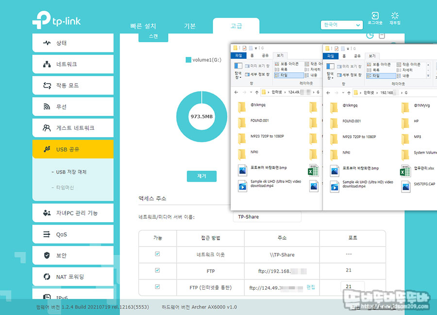 USB 메모리 연결 후 USB 공유 메뉴를 통해 192.x.x.x IP를 내부 접속, 124.x.x.x IP를 통한 외부 접속 설정과 MAC OS에서 지원하는 타임머신 기능도 사용도 가능하니 참고 하기기 바랍니다.
