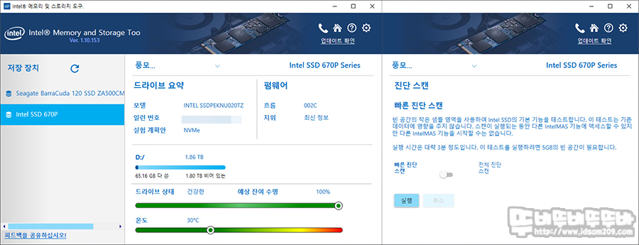 마지막으로 인텔에서 제공하는 SSD 전용 소프트웨어를 살펴보면 시스템에 장착된 인텔 670p 상태와 진단 스캔, 펌웨어 업데이트, 최적화, 데이터 삭제 그리고 내부 캐시를 제거해주는 성능 부스터 기능을 제공하고 있어 다른 디스크에서 파일을 가져오기 전 성능 부스터를 실행 주면 조금 쾌적한 속도로 파일 복사 가능합니다.
