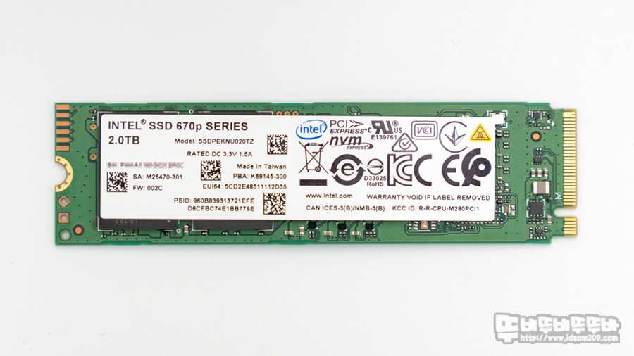 인텔 670p M.2 NVMe SSD는 2280 규격의 SSD로 밝게 보이는 녹색 PCB 전면에 컨트롤러, DRAM, 메모리를 내장하고 있으며 M.2 방식의 PCIe 3.0 x4 속도를 지원하기에 현존하는 대부분의 노트북과 PC에 사용이 가능합니다.