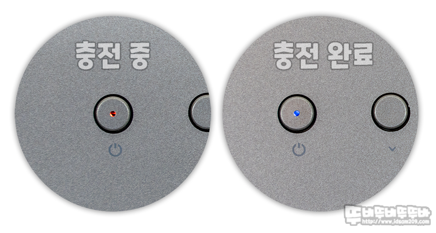 충전 중 시에는 전원 버튼에 Red LED 점등, 완충 시에는 Blue LED로 점등되어 충전상태를 확인할 수 있었습니다.