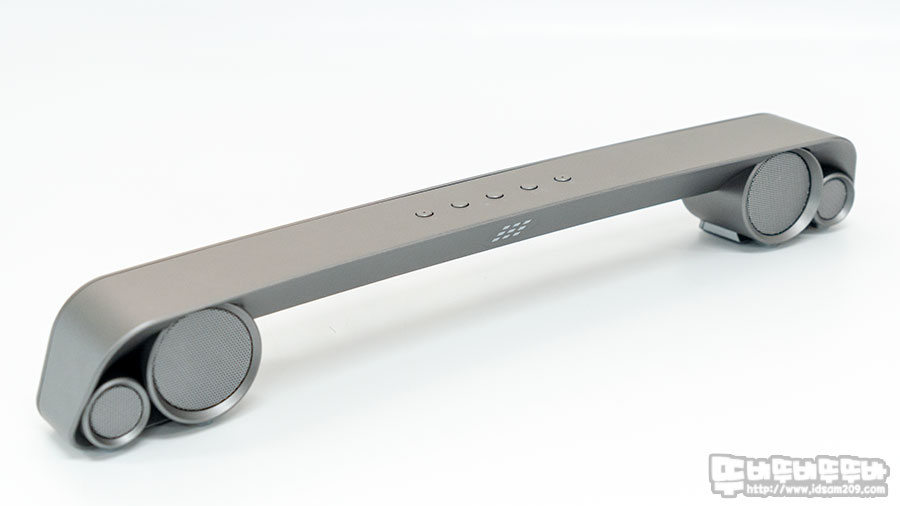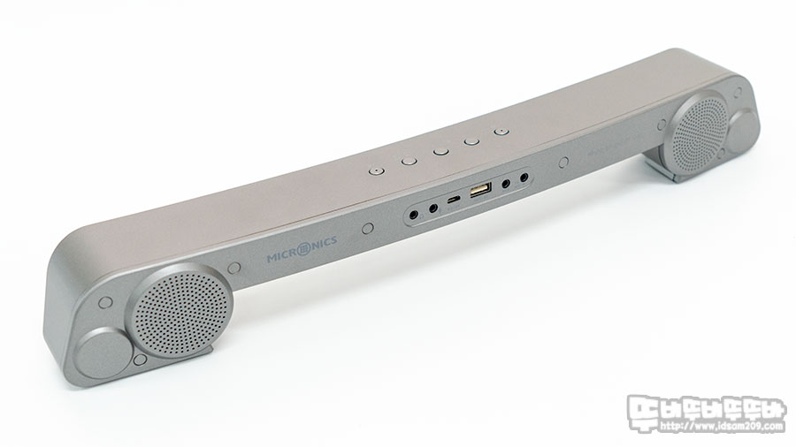 마이크로닉스 ROUND STUDIO BT-1000 V2 블루투스 커브드 스피커는 450mm 길이의 바 타입 디자인으로 중앙에는 마이크로닉스 로고 모양의 LED 인디케이터와 양쪽 끝부분에 각 5W 출력을 지원하는 42mm 드라이브 유닛을 사용하였습니다.