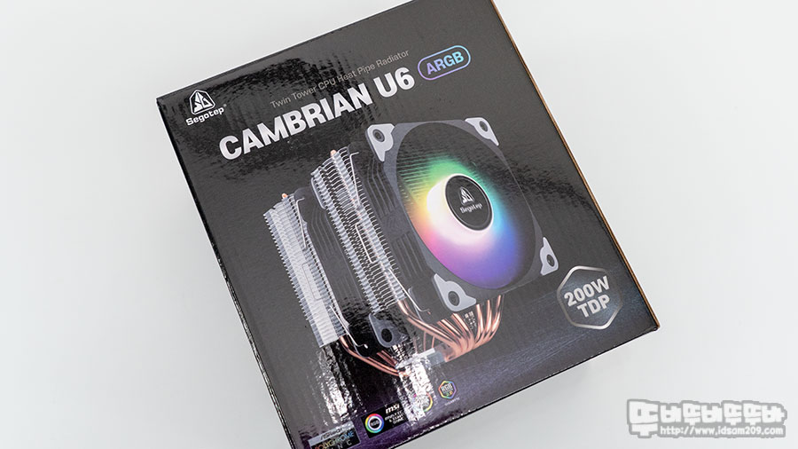 Segotep Cambrian U6 CPU 패키지에는 제품의 이미지와 모델명 200W TDP CPU 지원 그리고 메인보드 SYNC 지원한다는 내용이 인쇄되어있습니다.