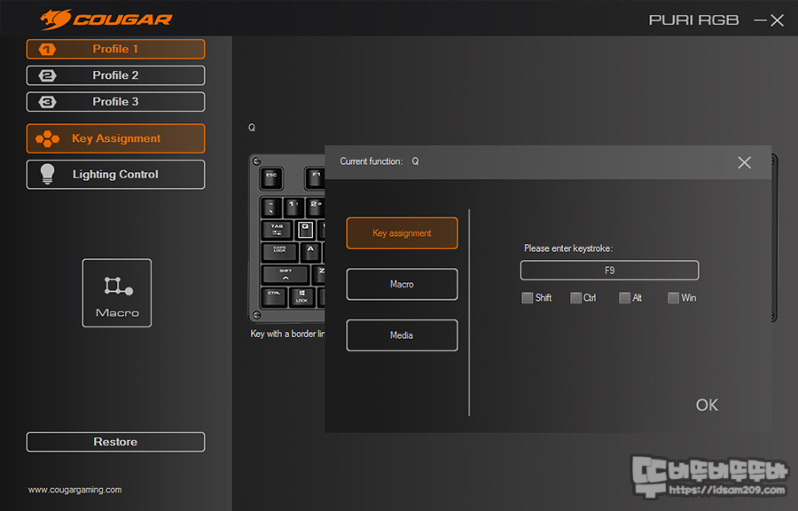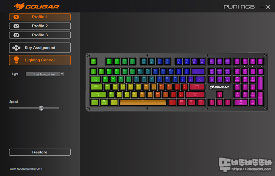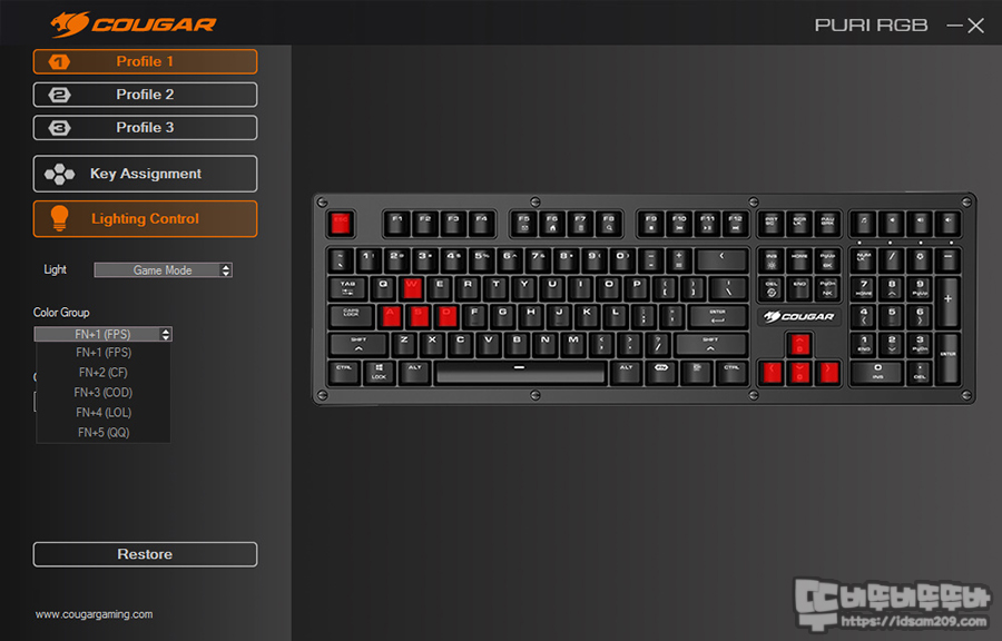 Cougar UIX 소프트웨어는 상당히 심플한 편으로 왼쪽에 Profile / Key Assignment / Lighting Control 메뉴로 구성되어있는데요.