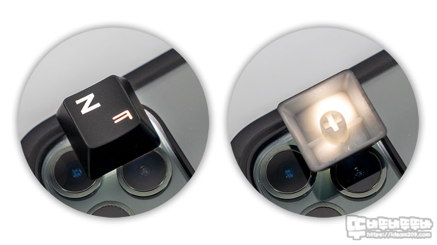 스마트폰 플래시를 이용한 키캡 LED 빛 투과 모습.