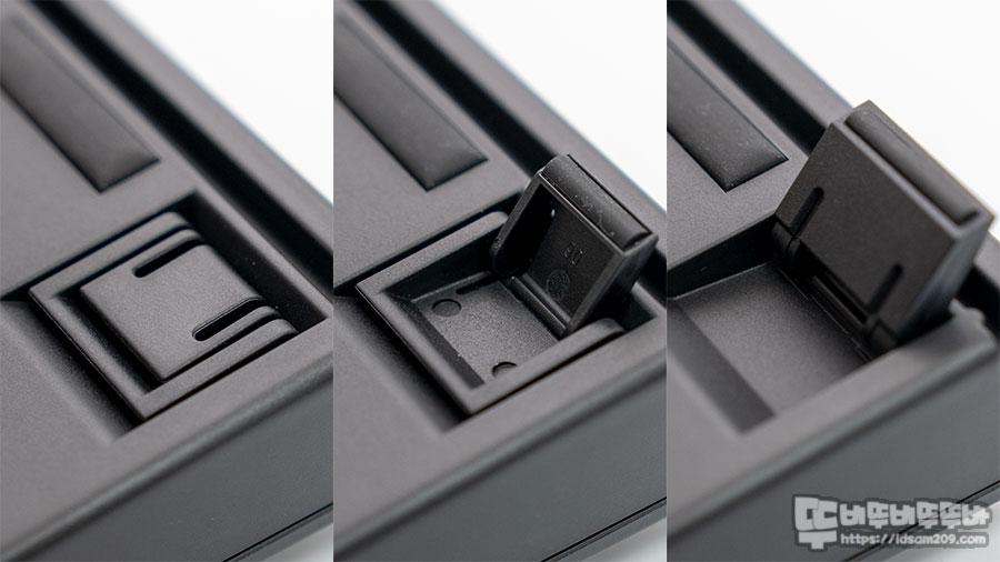 모서리에 자석이 내장된 플라스틱 커버는 키보드 상단의 나사에 고정하는 구조로 자석의 체결력으로 고정되어 거치 또는 이동 시 키보드를 보호하기에 여러모로 활용도가 좋은 편입니다.