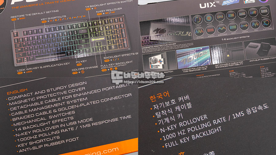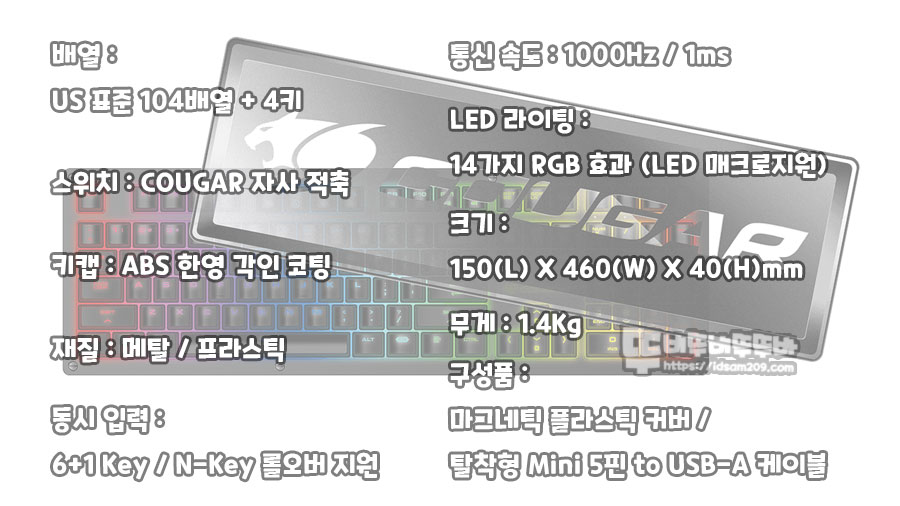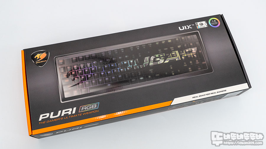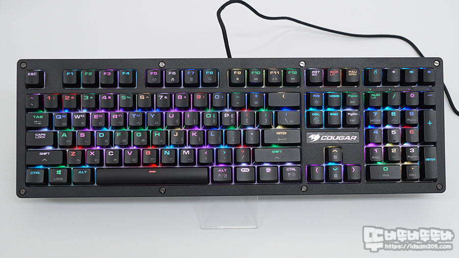 쿠거에서 개발한 자체 스위치를 사용한 COUGAR RURI RGB 키보드는 14가지 LED 이펙트와 LED 매크로 지원하는 풀배열 게이밍 키보드로 1000Hz/1ms 반응 속도와 블링블링한 LED 광량이 일품인 제품인데요.