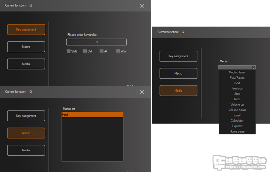Key Assignment는 기본 키를 다른 키로 설정하는 키 스왑, 모디 키 조합 명령, 매크로키 지정, 기본으로 제공되는 미디어 키를 키에 부여할 수 있는 기능을 제공하는데요.