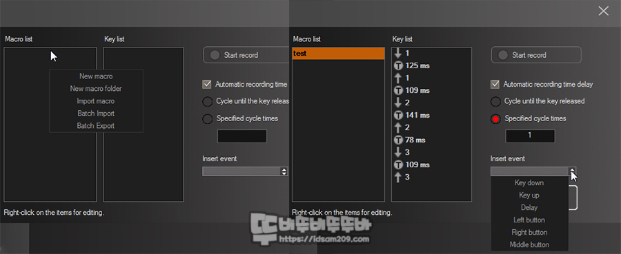 리스트 메뉴에서 마우스 오른쪽 버튼을 눌러 매크로 이름을 저장하고 Star record 버튼을 눌러 매크로 키를 저장하면 매크로키 설정이 되며 Insert event를 이용하여 키 up/down, 딜리버리 값 수정, 마우스 버튼 기능을 추가할 수 있습니다.