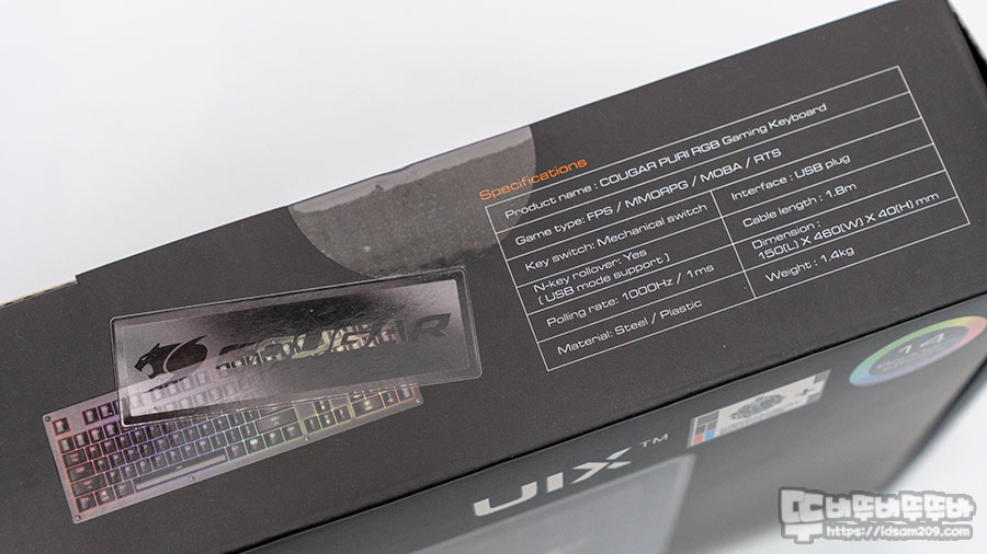 COUGAR PURI RGB 게이밍 키보드 패키지에는 쿠커 로고가 각인된 플라스틱 커버가 씌워진 키보드 모습과 제품의 모델명을 확인할 수 있는데요.