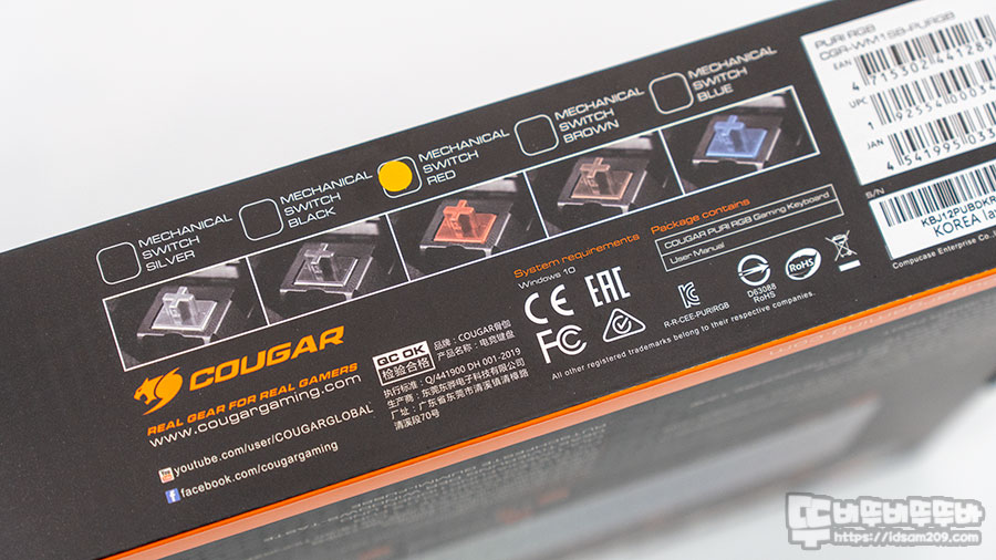 패키지 측면에는 키보드에 사용된 쿠거 자사 스위치 정보를 확인할 수 있는데 제가 리뷰하는 제품은 RED (리니어 적축)입니다.