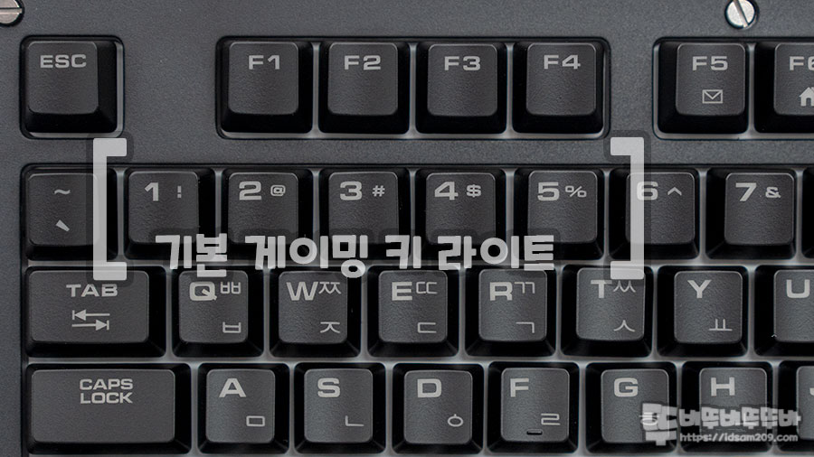 역방향 스위치 설계로 키캡 상단의 영문 각인을 두꺼운 폰트를 사용하여 LED 투과가 잘되게 디자인되었으며, 한글과 영문 각인 이외에는 Fn 기능 조합으로 사용하는 F 펑션 열의 멀티미디어 키, 모디 배열에 LED 기능과 6 키/N키 변환 기능 키부 분만 기능을 표시하고 있는 게 특징입니다.