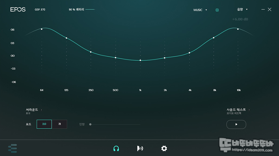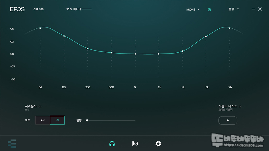 반대로 반원 형태의 EQ 레벨을 가지고 있는 Music / Movie의 경우 중고음이 균형감을 이루고 있어 좋았고 가상 7.1 채널 설정과 반향 기능을 레벨을 조절하면 입체감 있는 사운드로 게임 플레이를 즐길 수 있었습니다.