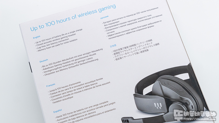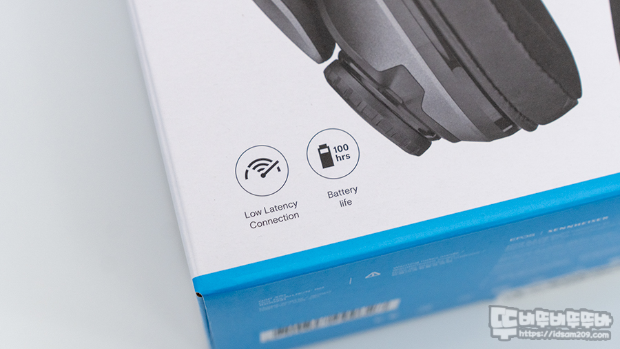 EPOS 젠하이저 GSP 370 무선 게이밍 헤드셋 패키지에는 제품의 실물 이미지가 인쇄된 모습에 제품의 모델명과 로우 레이턴시 및 100시간 배터리 타임을 지원하는 내용이 명시되어있습니다.
