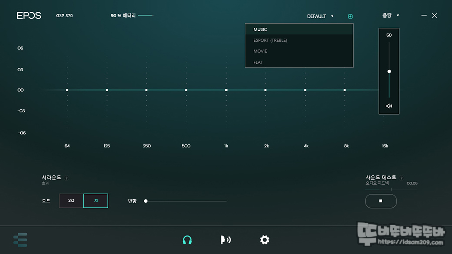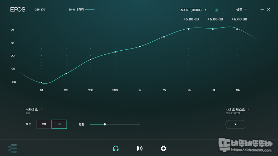 기본으로 MUSIC / ESPORT (TREBLE) / MOVIE / FLAT 4가지 EQ 프리셋을 제공하고 있으며, 메뉴 하단을 통해 2채널 스테레오, 가상 7.1 채널을 선택이 가능하며 가상 7.1 채널 사용 시 활성화되는 반향 기능을 이용하면 가상 사운드의 입체감을 조절하실 수 있습니다.