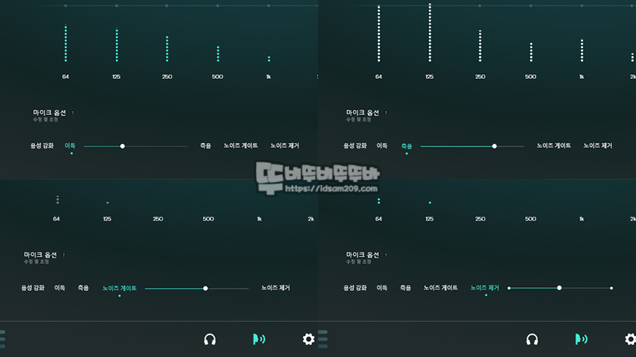 마이크 설정의 경우 음성 강화 / 이득(Gain) / 측음(모니터링) / 노이즈 게이트 / 노이즈 제거 등의 메뉴를 통해 마이크 성능을 개선할 수 있는데요.