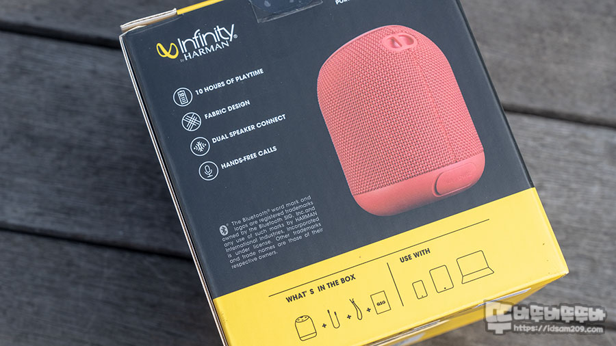 인피니티 CLUBZ 250 포터블 블루투스 스피커 패키지에는 제품의 브랜드 및 제품명 그리고 제품의 실물 이미지 그리고 제품의 특징을 잘 표현되어 있는데요.