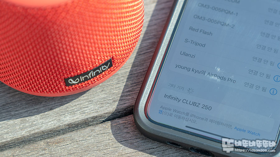 스피커의 전원 버튼을 눌러 처음 작동 시 페어링 모드 진입하게 되며 스마트폰 블루투스 기기 리스트에 등장하는 "Infinity CLUBZ 250"를 선택하여 페어링 해주면 되며 최초 페어링 이후에는 오토 페어링으로 사용하게 됩니다.