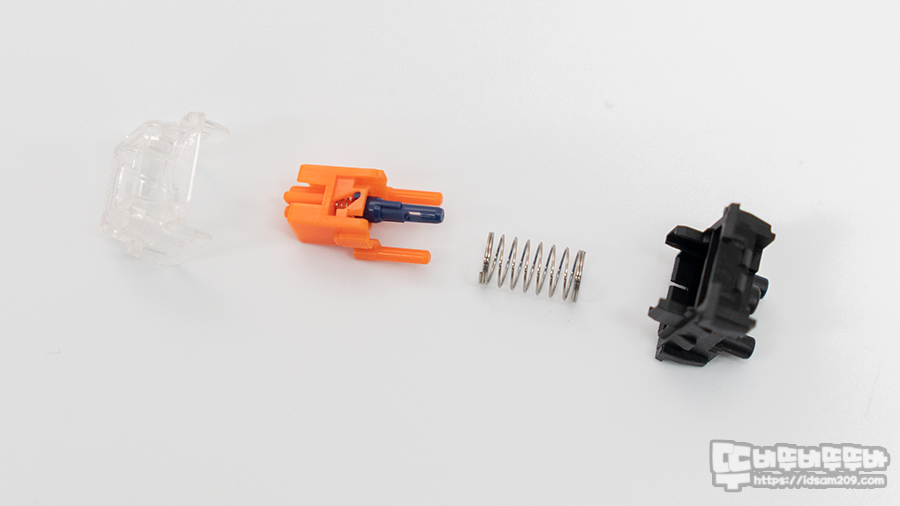 JIXIAN 4세대 광축 스위치 구조를 살펴보면 스템의 상부와 하부가 대각선으로 비틀어지는 형태로 클릭 소리를 구현하며 중앙에 원형 스프링이 키압을 담당하는 구조로 심플하게 구성되어 있습니다.