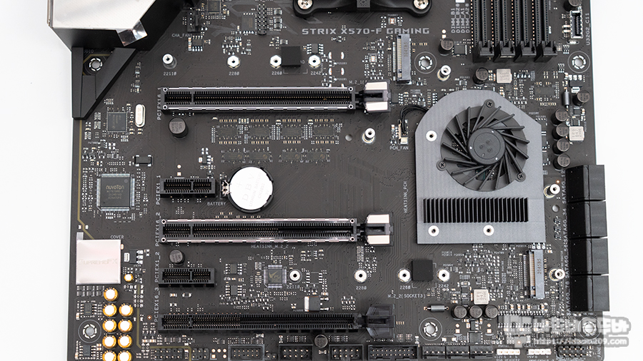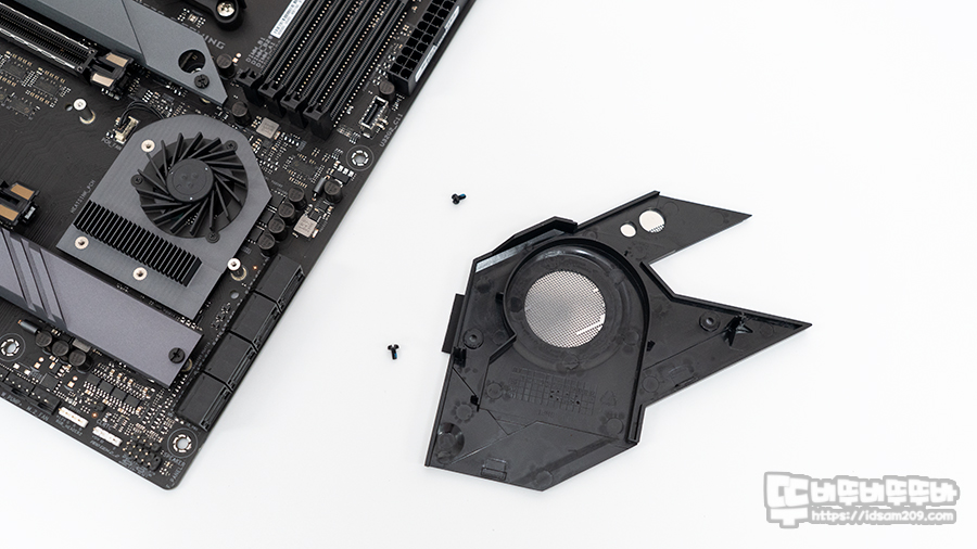 X570 브릿지 부분은 전용 냉각 쿨러는 블로워 팬이 사용되어 브릿지 히트싱크 내각과 아래 위치한 M.2 2번 슬롯의 간접 냉각을 도와줍니다.