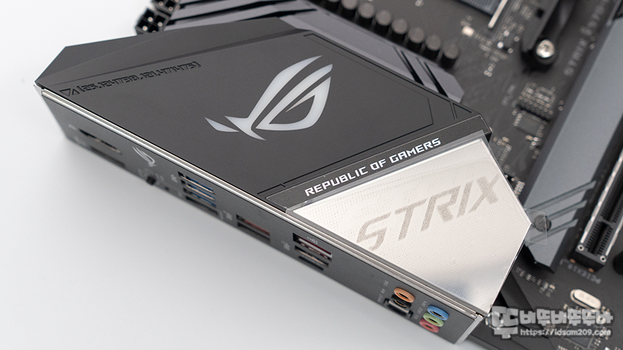 일체형 I/O 포트와 커버 형태로 덮여있는 쉴드 상단에는 ARGB 점등이 되는 ROG 로고와 STIRX 로고 디자인이 제품의 프리미엄 느낌을 줍니다.