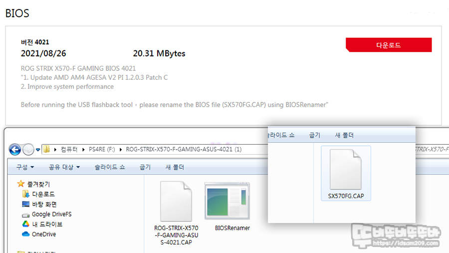 리뷰 작성일 기준 가장 최신 버전은 4021 버전으로 바이오 관련 압축파일을 다운로드 후 Bios Renamer 배치 파일을 실행하면 SX570FG.CAP으로 변경된 바이오스 파일을 USB 메모리에 복사하여 메인보드 후면에 BIOS 표기된 USB 포트에 꼽고 BIOS FLBK 버튼을 눌러줍니다.