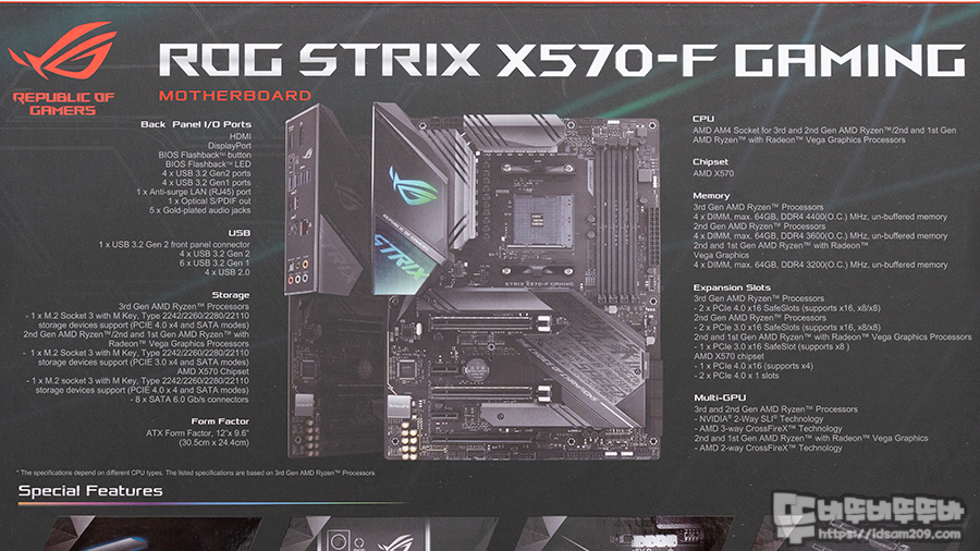 라이젠 3000, 5000 시리즈 지원, X570 칩셋 사용, 듀얼 VGA 구성인 nVIDIA의 SLI, AMD의 CrossFire 지원, AURA Sync, PCIe 4.0 지원 등의 대표적인 기능을 확인할 수 있네요.