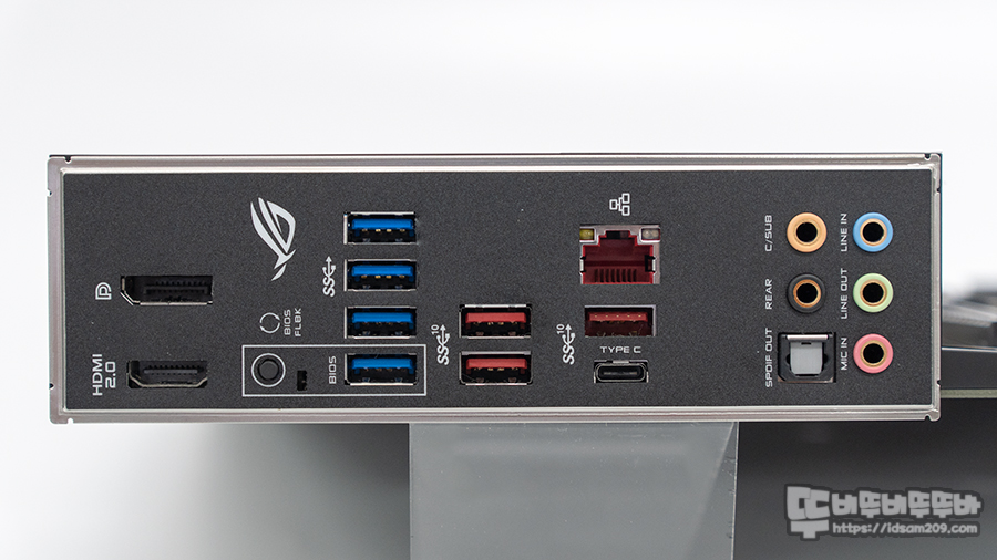 일체형으로 디자인된 I/O 쉴드의 구성은 DisplayPort / HDMI / USB BIOS FlashBack 버튼 및 LED 인디케이터 / USB 3.2 Gen 1 (up to 5Gbps) 포트 / USB 3.2 Gen 2 (up to 10Gbps) 포트 (레드 컬러) / USB 3.2 Gen 2 (up to 10Gbps) USB-C 포트 / Intel® I211-AT 기가비트 LAN 포트 / 오디오 단자 및 광출력 단자로 구성되어 있습니다.