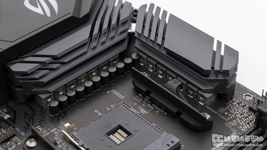 전원부의 MOS 방열판은 8mm 히트파이프를 더하여 꽤 냉각에 신경 쓴 느낌을 주며 쉴딩 처리된 8+4핀 보조전원 커넥터 구성을 확인할 수 있습니다.