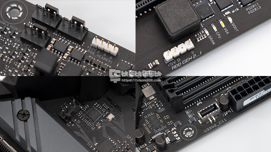 전체적으로 넉넉한 시스템 팬 커넥터 (CHA_FAN)과 메인보드 위/아래로 구성된 워터펌프 커넥터 그리고 M.2 FAN 커넥터를 제공하는 게 특징이며, 특히 다양한 시스템 빌드 중에 LED 케이블을 연결하다 보면 메인보드에 연결하기 힘든 부분이 있는데 RGB LED을 위한 연장선을 제공하고 있어 손쉬운 조립이 가능하였습니다.