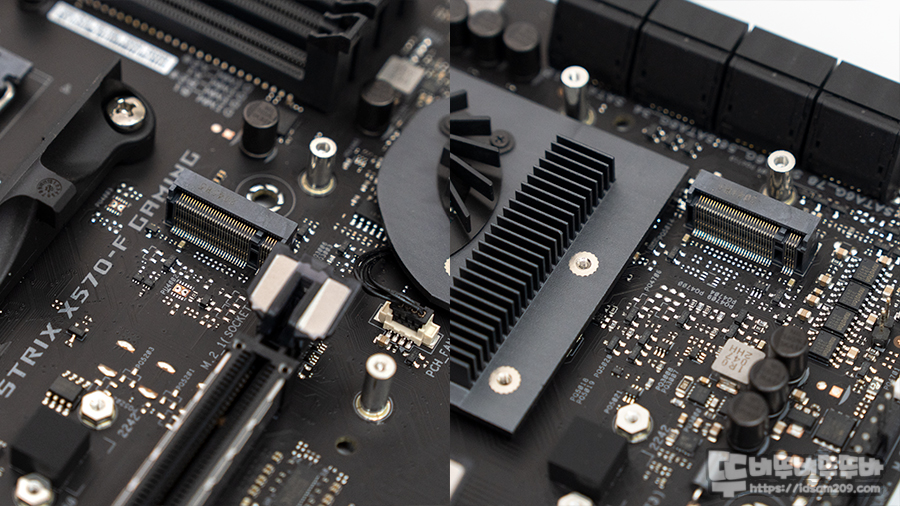 전원부 히트 파이프와 히트 싱크 구성, 칩셋 전용 쿨링팬을 기본으로 장착하고 있는 ROG STRIX X570-F GAMING은 안정성과 편리성 거기에 PCIe 4.0을 지원하고 있어 그래픽카드, M.2 SSD를 최고의 성능을 사용할 수 있는 메인보드인데요.