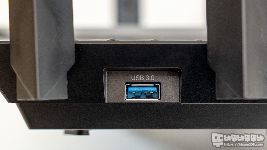 제품의 포트 부분을 살펴보면 공유기 우측면에 위치한 USB 3.0 포트 그리고 후면의 USB 2.0 포트를 지원하여 외장 HDD와 USB 메모리를 이용한 스토리지 기능을 지원하고요.