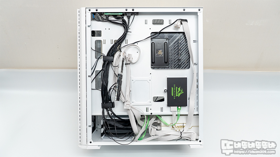 I/O 포트 케이블이 샤시 뒤쪽에 있어 케이블 정리에 수월한 편이지만 쿨링팬의 IDE 커넥터와 파워서플라이 케이블 부피 등 케이블 정리 시 사이드 패널이 결합에 방해가 되지 않게 신경 쓰셔야 할 거 같습니다.
