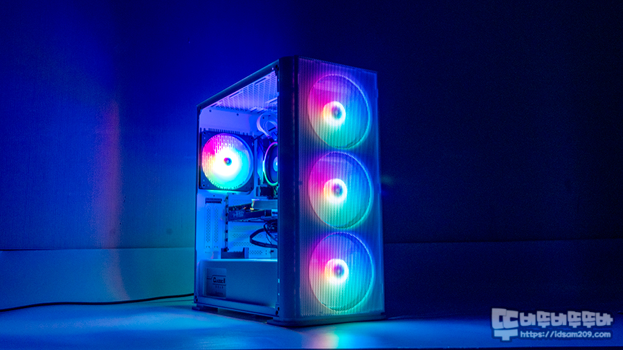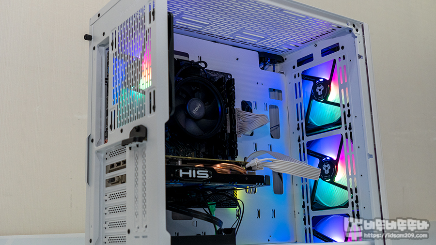 쿨링팬의 RGB LED가 작동 중인 케이스 내부 모습.
