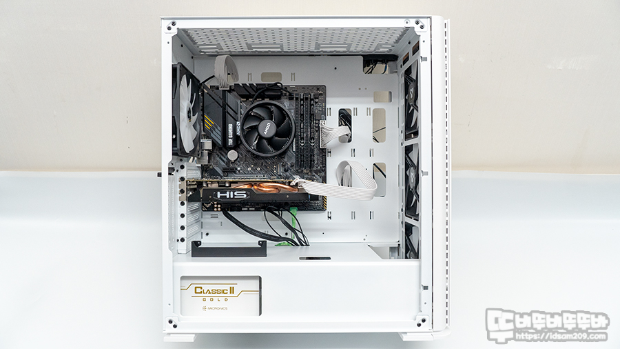 M-ATX 메인보드를 사용해서 그런지 케이스 내부가 꽤 널널해 보이는데요. ATX 메인보드를 사용하더라도 슬롯 가이드 부분만큼 내려오는 것 이외에 꽤 여유로운 내부 구조를 확인할 수 있습니다.