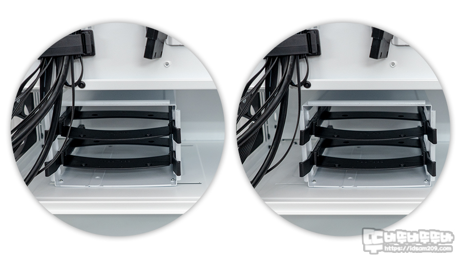 파워서플라이가 장착되는 공간의 HDD/SSD 장착 가이드 샤시는 바닥면의 손나사를 살짝 풀러 수랭 쿨러 장착 또는 길이가 긴 파워서플라이 장착에 따라 좌우로 이동이 가능하여 조립에 편리성을 제공합니다.
