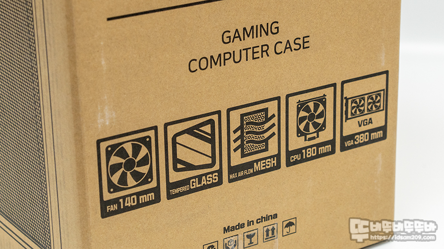 패키지 측면에 아이콘으로 표현되는 제품의 특징으로 140mm 쿨링팬 기본 장착 / 강화유리 패널 / 공기 흐름을 위한 메쉬 디자인 / CPU 쿨러 180mm 높이 수용 / VGA카드 최대 380mm 길이 수용 등을 확인할 수 있습니다.