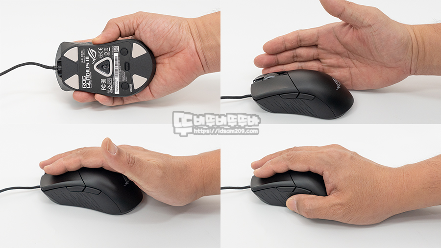 ASUS ROG GLADIUS III 게이밍 마우스는 오른손 전용으로 비대칭 마우스로 뒤쪽 부분이 두툼하게 디자인되어 손이 큰 필자에게 좋은 그립감을 주었습니다.
