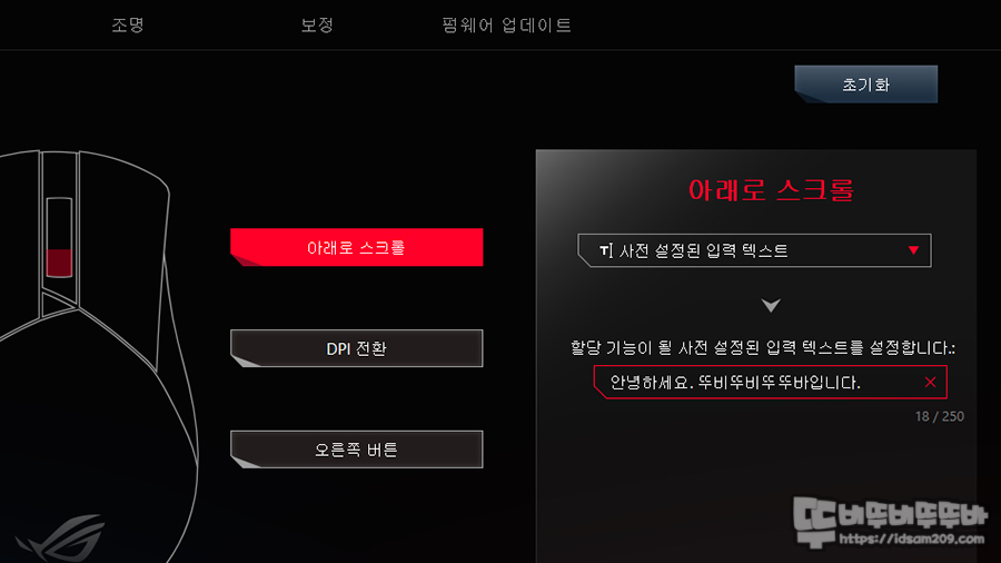 네모칸으로 표시되는 기능 또는 마우스 그림에서 버튼을 선택 조금 더 편하게 선택할 수 있으며 대부분의 기능은 보통의 마우스에서 제공하는 기능과 동일하지만 간단 매크로 기능인 "사전 설정된 입력 텍스트" 기능은 조금 획기적인 기능이라 할 수 있을 거 같습니다.
