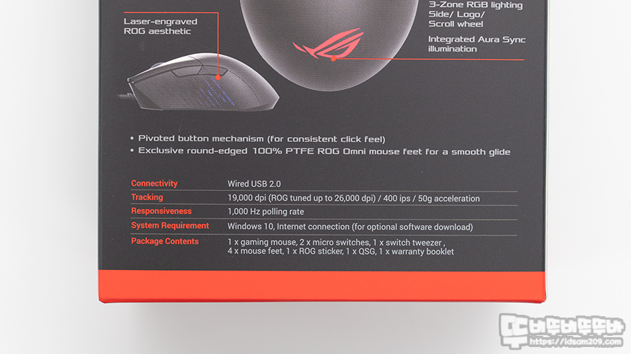 유선 방식 USB 2.0 / 오른손잡이 비대칭 디자인 / 센서 PixArt PAW3370 / DPI 19,000dpi (최대 26,000dpi 지원) / 최대 속도 400ips / 최대 가속도 50g / USB 폴링 레이트 1000Hz / 프로그램 버튼 6개 / ROG 마이크로 스위치 (7천만 번 클릭 수명) / 옴론 광 마이크로 스위치 (100만 번 클릭 수정) / 온보드 프로파일 5개 지원 / 3개의 RGB LED 존 (로고/스크롤 휠/측면) / 크기 126mm X 67mm X 45mm / 무게 76g 등을 확인할 수 있습니다.