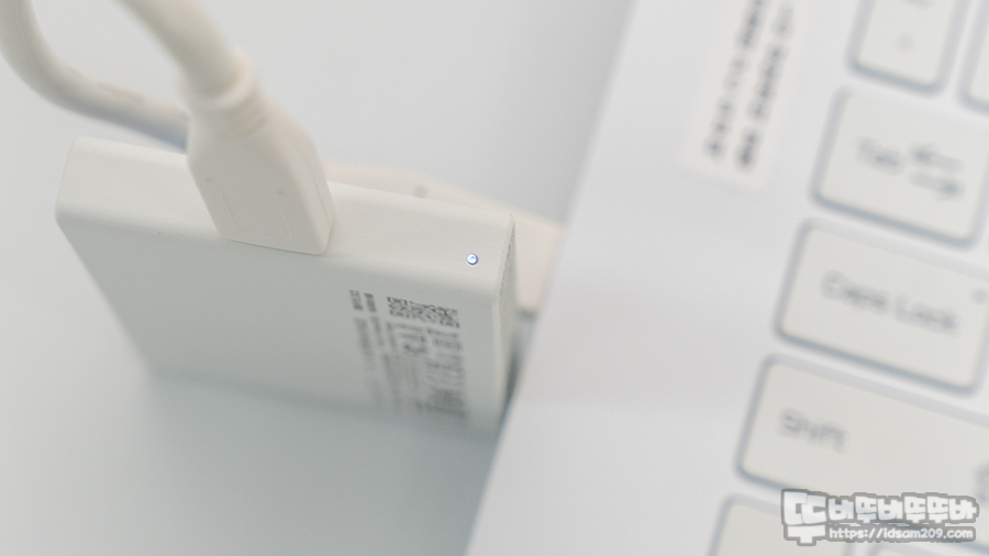 컴퓨터 연결 시 점등으로 표현되는 LED 인디케이터는 외장 SSD 사용 중 작동상태가 의심스러울 때 확인할 수 있는 부분이니 위치를 알고 계시면 도움이 되실 거예요.