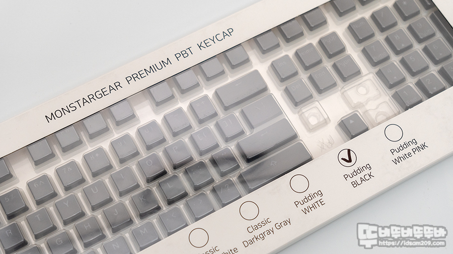 리뷰를 위해 다양한 제품이 추가로 제공되었는데 먼저 소개해드릴 제품은 PBT 영문 정각 푸팅 블랙 키캡입니다.