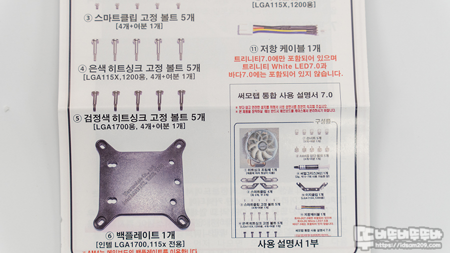 제품은 트리니티 7.0 쿨러 본체, 사용 설명서, 인텔 백플레이트, 저항 케이블, 스마트 클립 4개, 이지 클립 1개, 스마트 클립 고정 볼트 5개, 은색 히트 싱크 고정 볼트 5객, 검은색 히트 싱크 고정 볼트 5개, 손 너트 5개, AMD 무뽑기 방지 양단 볼트 5개, 써멀그리스 1개로 구성되어 있는데요.