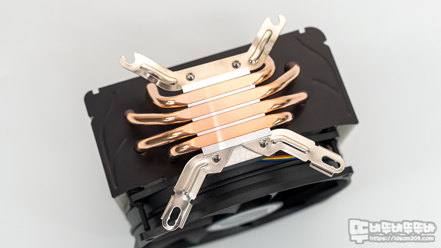 쿨러 전면의 130mm 쿨링팬은 히트 싱크보다 위/아래가 더 튀어나는 구조로 쿨링팬 아래 여분의 바람이 VRM 회로의 냉각을 지원하는데요.