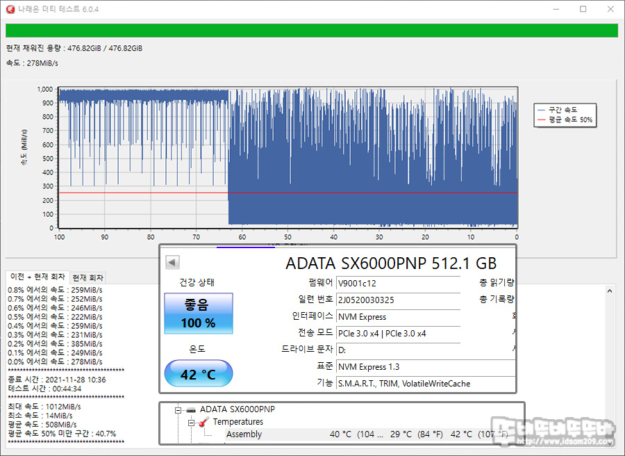 연속 쓰기 테스트를 하는 나래 온 더티 테스트 중에서 온도 변화를 확인해 보면 최대 42도를 보여주었습니다.