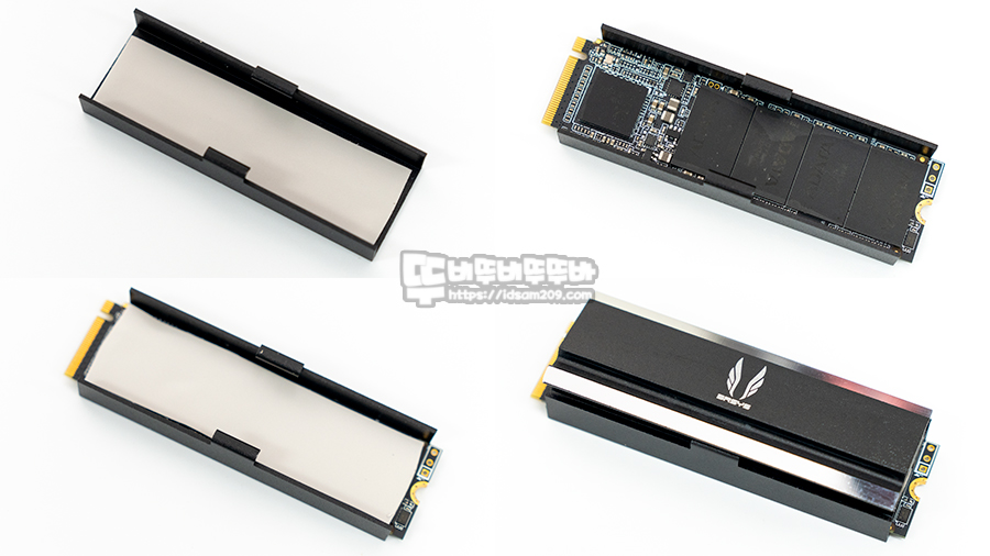 그리고 M.2 NVMe SSD를 슬라이딩 방식으로 넣어 부착 - 샌드위치 방식으로 서멀 패드를 추가 부착 - 상단 히트싱크를 슬라이딩 방식으로 넣어 부착해 줍니다.