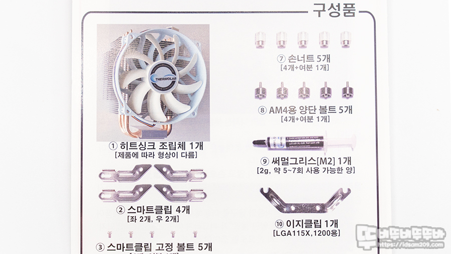 제품 사용 설명서에는 초심자도 조립할 수 있는 자세한 설명과 부품에 대한 설명이 자세히 인쇄가 되어있으며 필자는 AMD 시스템을 사용하기에 AMD 시스템에 장착하여 온도 테스트를 진행해 보도록 하겠습니다.